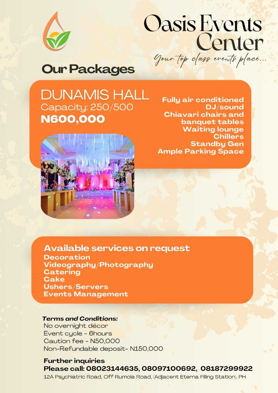Welcome to The Oasis Center - your top-class event venue nestled in the heart of Port Harcourt. Our center is designed to be an oasis of calm, featuring two spacious, air-conditioned halls suitable for a variety of events including weddings, corporate gatherings, and special celebrations. With ample parking and modern facilities, we ensure every detail is taken care of for a seamless experience. Come and discover the tranquil atmosphere that sets us apart!